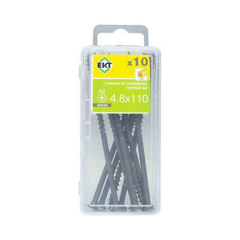 Саморез для гипсокартона по дереву 4.8х110 мм. Материал: сталь. Тип наконечника: острый. Шаг резьбы: крупный (3.1-3.2 мм). Упаковка: пластиковый контейнер. Количество в упаковке: 10 шт. Бренд: ЕКТ.