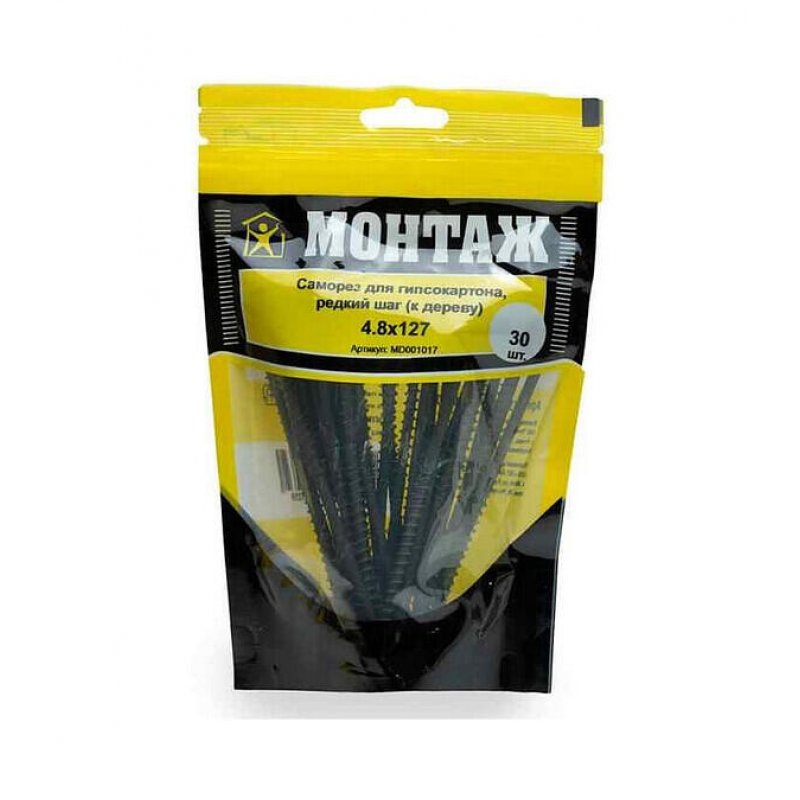 Саморез для гипсокартона по дереву, размер 4.8х127 мм. Фосфатное покрытие, крупный шаг резьбы (3.1-3.2 мм), острый наконечник. Упаковка: 30 шт в пакете. Производитель: ООО «ЕКТ Компани», Беларусь. Вес упаковки: 0.338 кг.