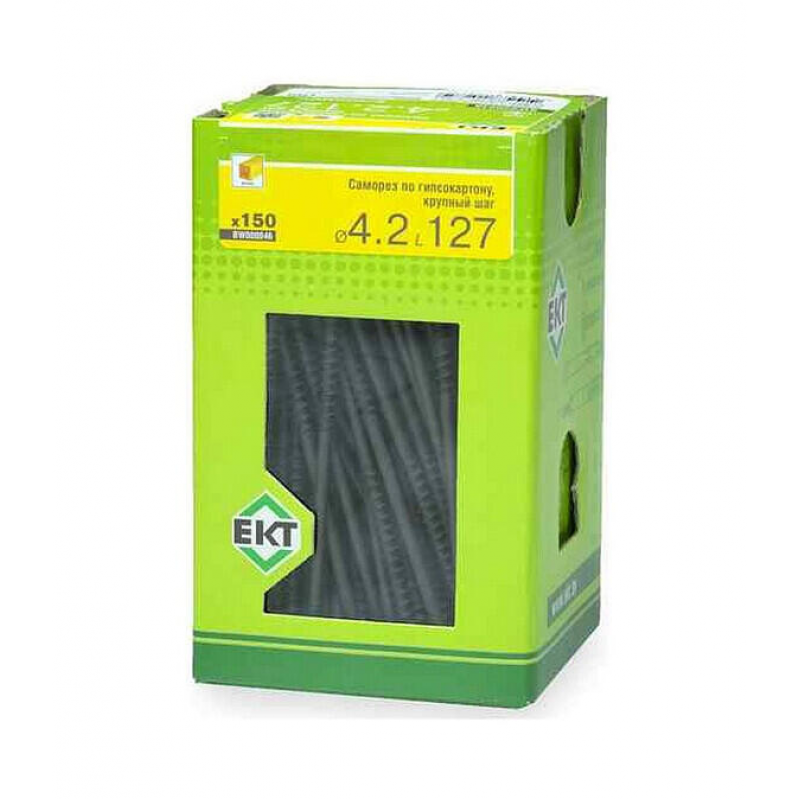 Саморез для гипсокартона по дереву, размер 4.8х127 мм. Крупный шаг резьбы (3.1-3.2 мм), острый наконечник, фосфатированное покрытие. Упаковка: картонная коробка с окном, 150 шт.