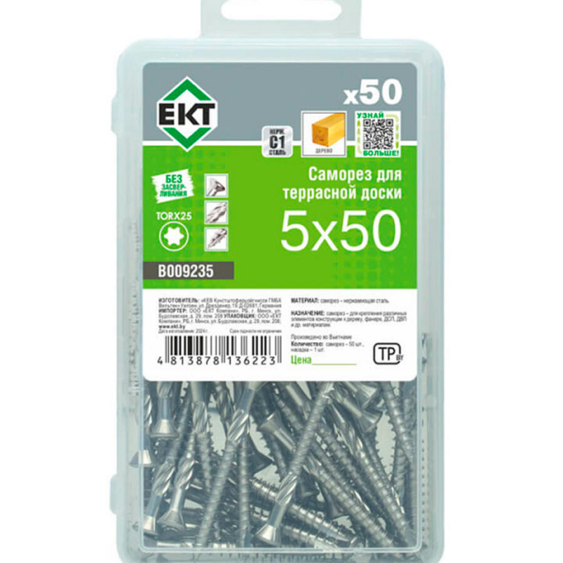 Саморез из нержавеющей стали для крепления террасной доски. Диаметр: 5.0 мм, длина: 50 мм. Острый наконечник с рёбрами. Упаковка: 50 шт в пластиковом контейнере. Бренд: ЕКТ, производство: Германия.
