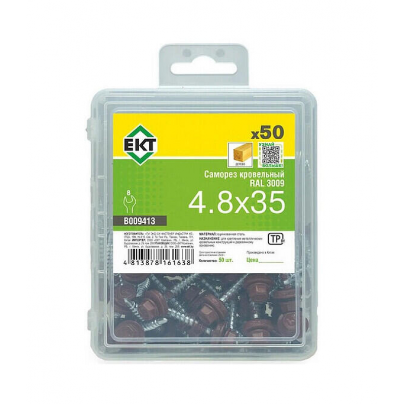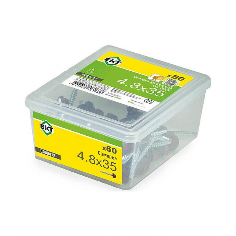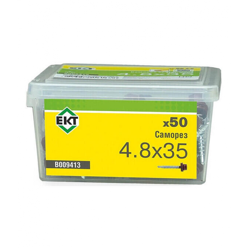 Кровельный саморез из стали с резиновой прокладкой. Размер: 4,8х35 мм. Наконечник со сверлом PT1. Цвет: RAL 3009 (красная окись). Упаковка: пластиковый контейнер, 50 шт.