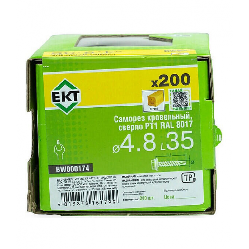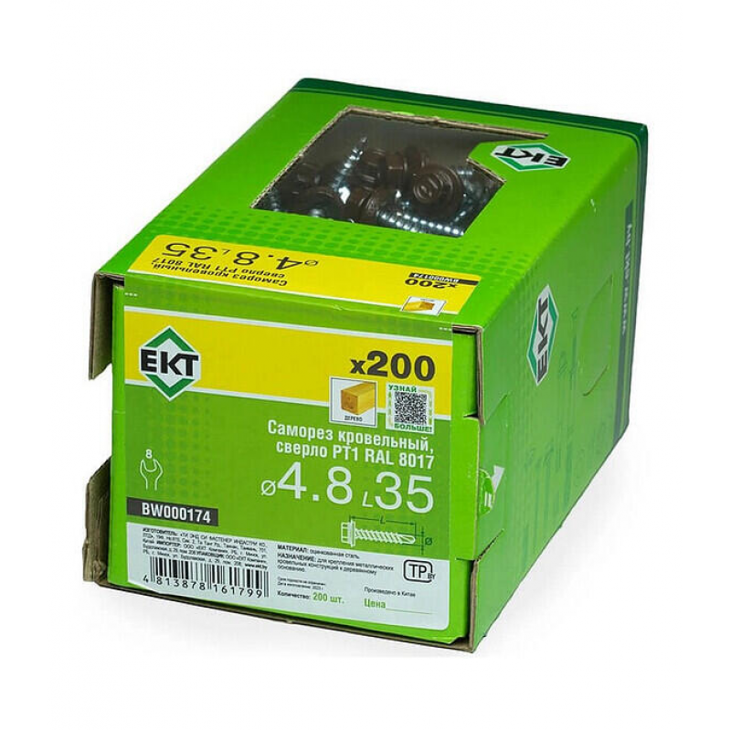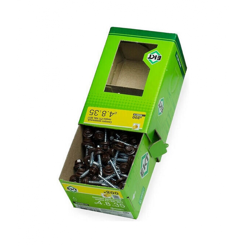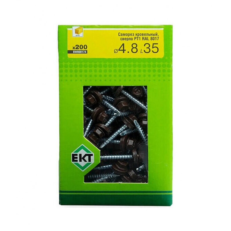 Кровельный саморез ЕКТ 4.8х35 мм со сверлом PT1 и резиновой прокладкой. Цвет: RAL 8017 (коричневый шоколад). Упаковка: картонная коробка (WBOX) 200 шт.