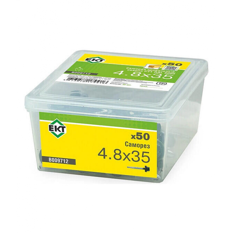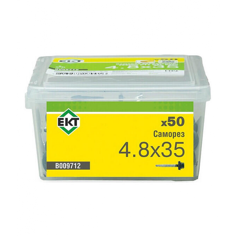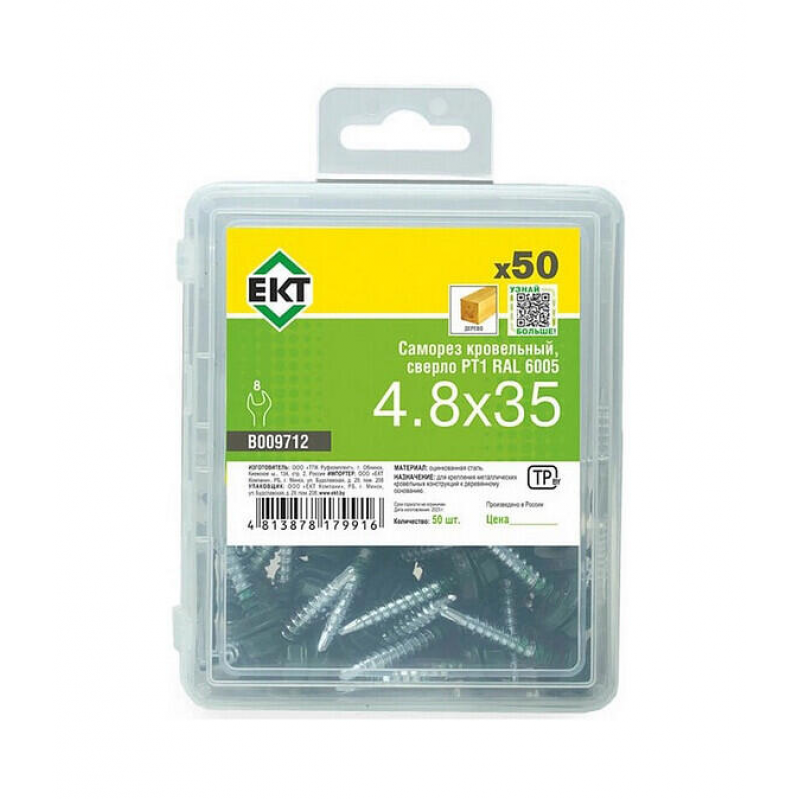 Кровельный саморез ЕКТ диаметром 4.8 мм и длиной 35 мм. Материал: сталь, шаг резьбы: 2.3 мм. Наконечник со сверлом PT1, резиновая прокладка в комплекте. Цвет: RAL6005 (зеленый мох). Упаковка: пластиковый контейнер, 50 штук. Вес: 0.35 кг. Производитель: ООО «ЕКТ Компани», Россия.