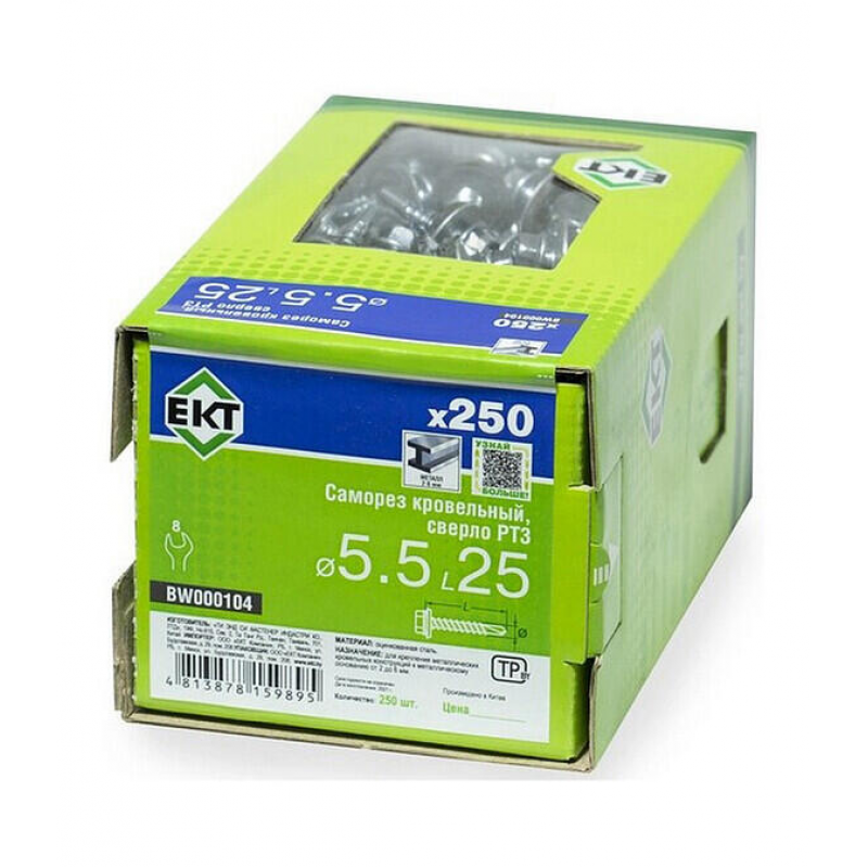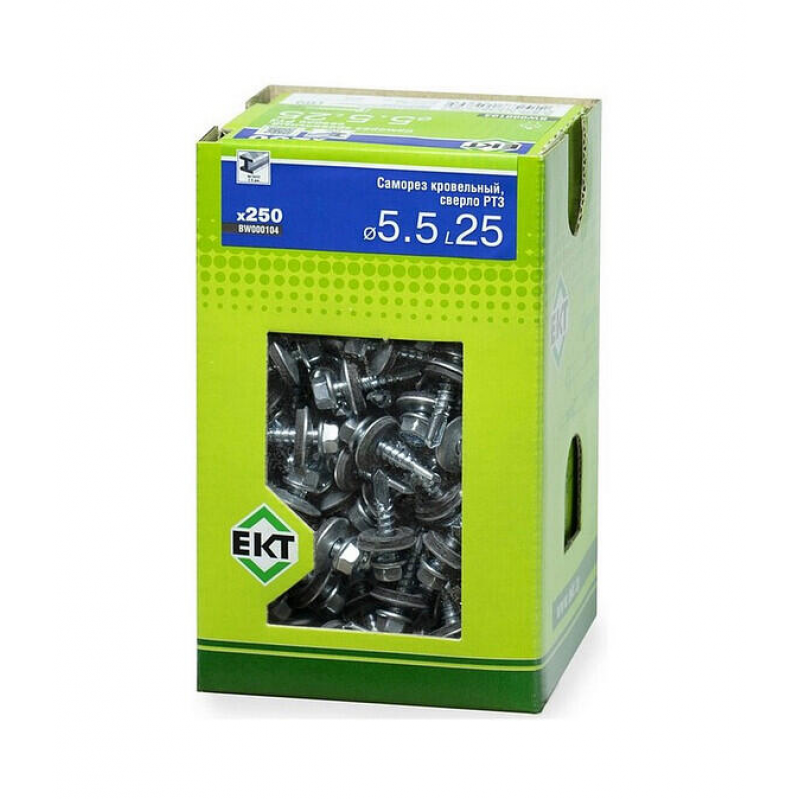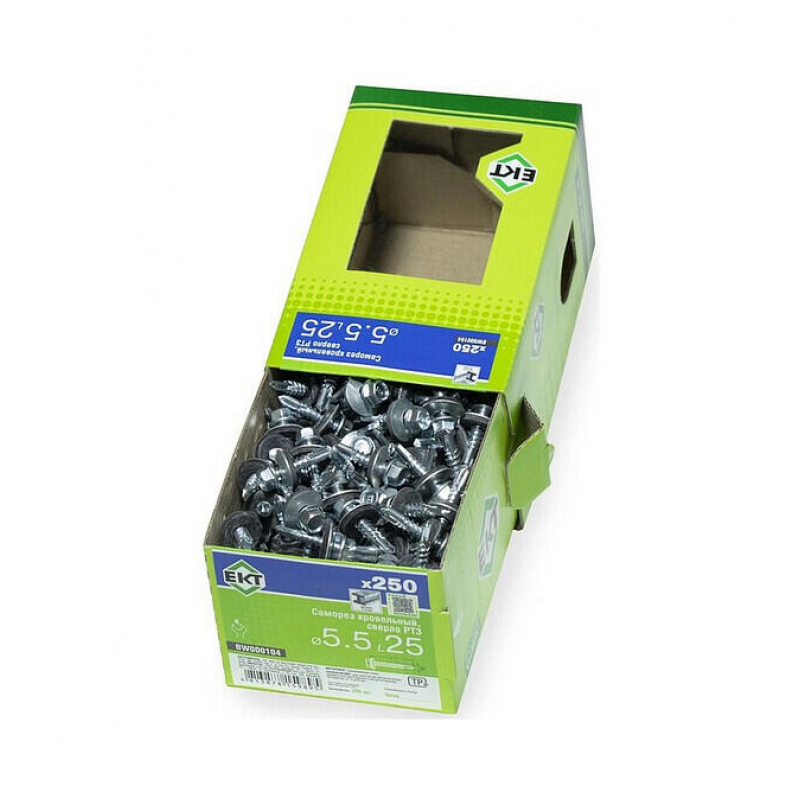 Кровельный саморез 5.5х25 мм со сверлящим наконечником PT3. Изготовлен из стали с цинковым покрытием. В комплекте резиновая прокладка для герметизации. Упаковка: 250 шт в картонной коробке.