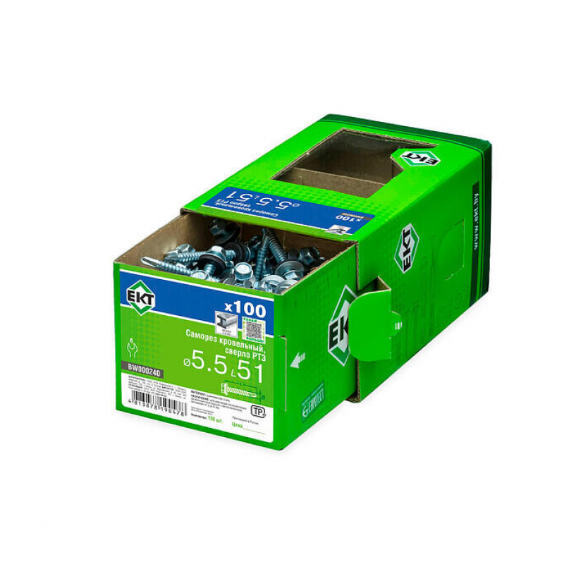 Кровельный саморез ЕКТ из стали с резиновой прокладкой. Размер: 5.5х51 мм. Сверловой наконечник PT3. Цинковое покрытие. Предназначен для крепления к металлу, в т.ч. оконных конструкций. Упаковка: 100 шт в картонной коробке. Произведено в России.