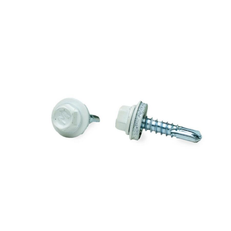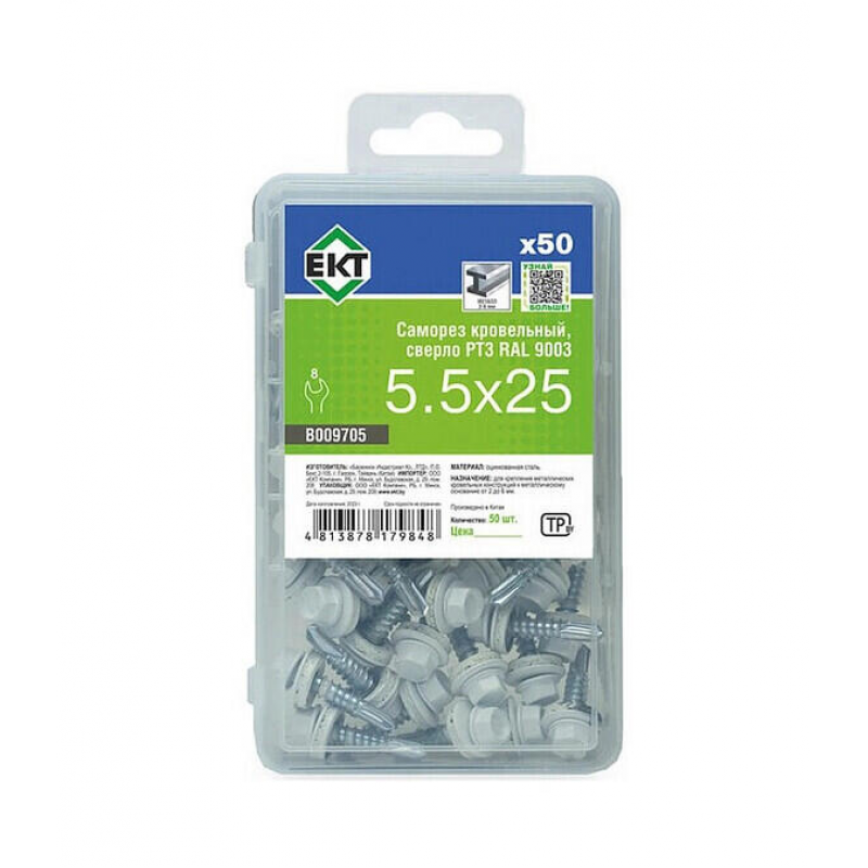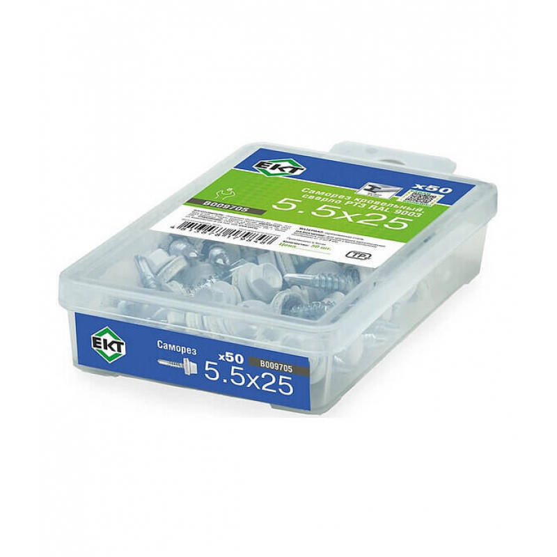 Кровельный саморез из стали с резиновой прокладкой. Размер: 5.5x25 мм. Шаг резьбы: 2 мм. Наконечник со сверлом типа РТ3. Цвет: белый (RAL9003). Упаковка: пластиковый контейнер, 50 штук. Вес упаковки: 0.31 кг. Бренд: ЕКТ. Производитель: ООО «ЕКТ Компани». Страна производства: Китай.