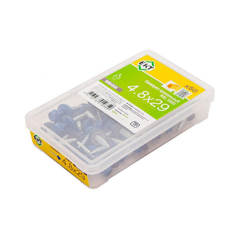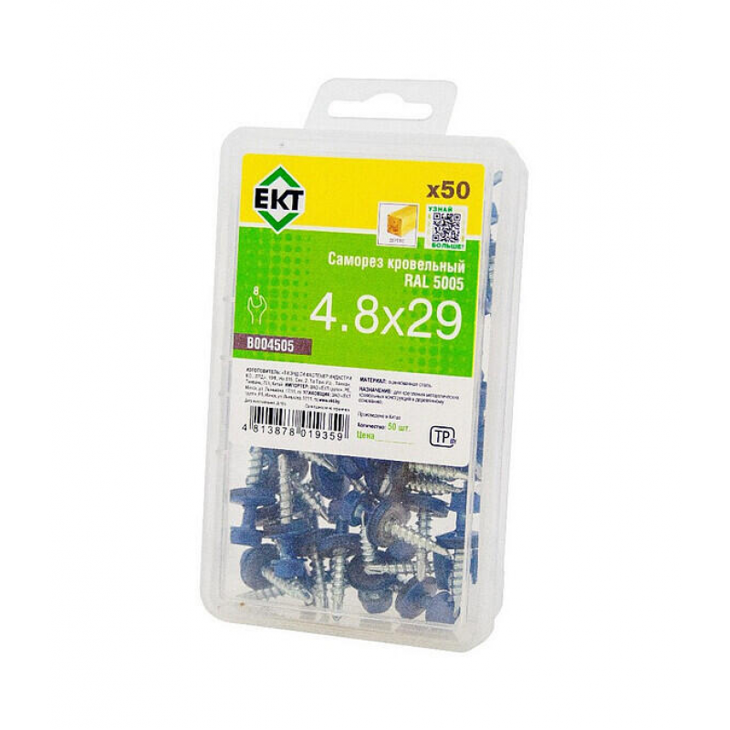 Саморез кровельный 4.8х29 мм со сверлящим наконечником и EPDM-прокладкой. Цвет: насыщенный синий (RAL 5005). Материал: сталь. Упаковка: пластиковый контейнер (50 шт). Шаг резьбы: 2.3 мм. Вес упаковки: 0.265 кг. Бренд: ЕКТ. Производитель: ООО «ЕКТ Компани», Китай.