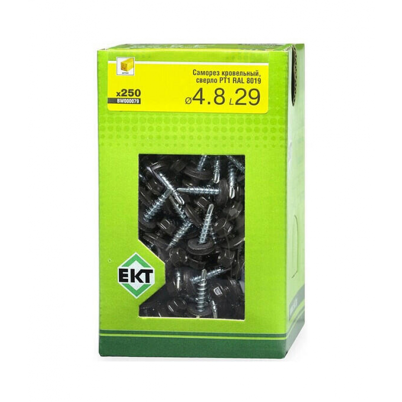 Кровельный саморез ЕКТ 4,8х29 мм со сверлом PT1 и резиновой прокладкой. Цвет: RAL8019 (серо-коричневый). Упаковка: 250 шт. в картонной коробке. Вес: 0.68 кг. Произведено в Китае.