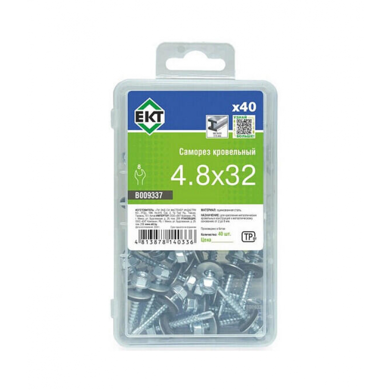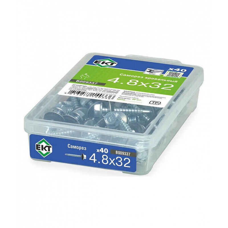 Кровельные саморезы из стали с цинковым покрытием, размером 4.8x32 мм. Оснащены сверлом для легкого монтажа и резиновой прокладкой для герметичности. Упаковка: пластиковый контейнер (40 шт).
