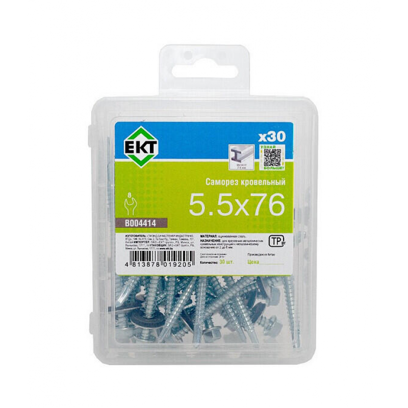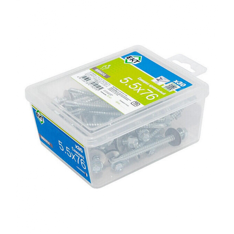 Саморез кровельный из стали с цинковым покрытием. Диаметр резьбы: 5.5 мм. Длина: 76 мм. Шаг резьбы: 2 мм. Наконечник со сверлом для легкого монтажа. Оснащен резиновой прокладкой для герметичности. Упаковка: пластиковый контейнер (BOX), 30 штук.