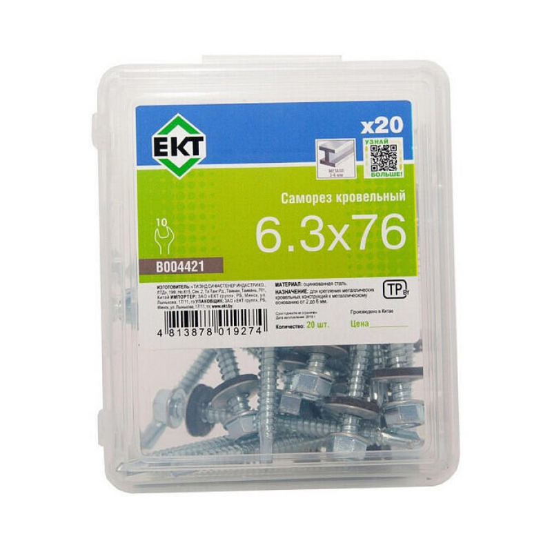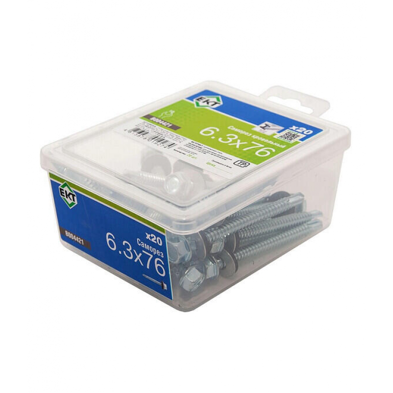 Саморез кровельный 6,3х76 мм со сверлом PT3 для металла. Изготовлен из стали с цинковым покрытием, комплектуется герметизирующей резиновой прокладкой. Упакован в пластиковый контейнер (20 шт/уп).