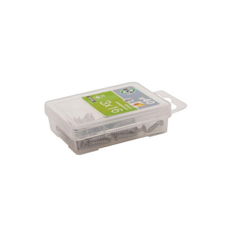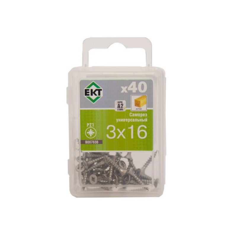 Универсальные саморезы из нержавеющей стали ЕКТ диаметром 3,0 мм и длиной 16 мм. Острый наконечник. Упаковка: пластиковый контейнер, 40 штук. Производство: Германия.