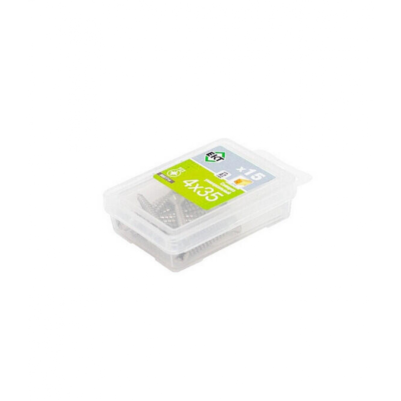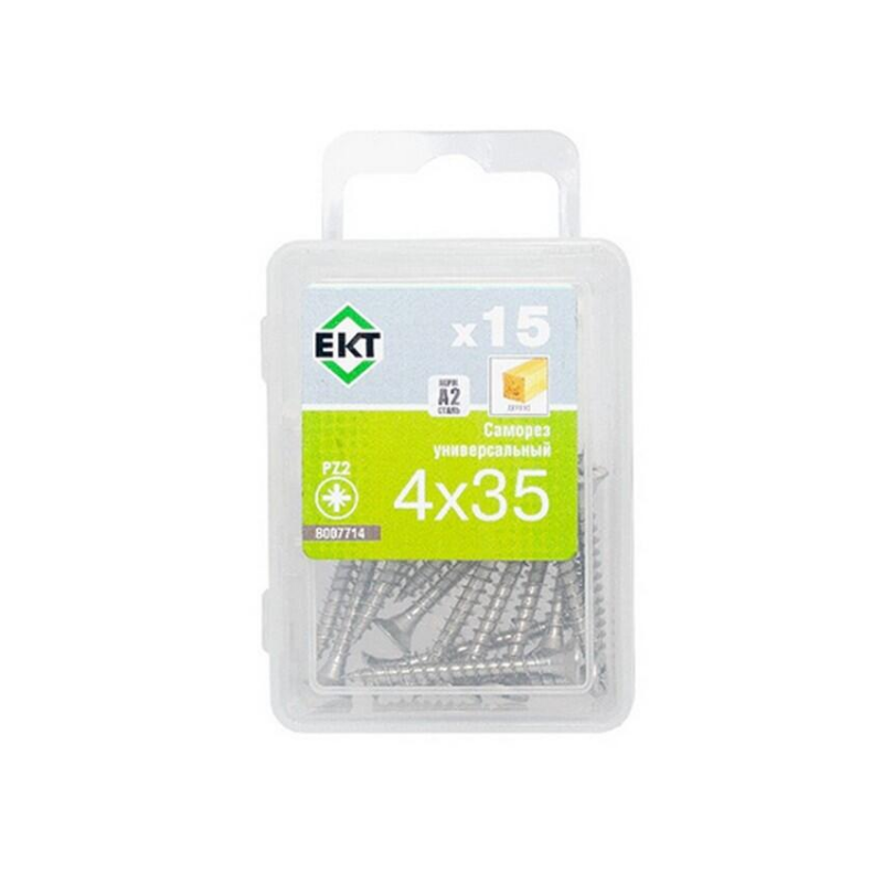Универсальный саморез из нержавеющей стали марки А2, размер 4,0х35 мм. Упаковка: 15 штук в пластиковом контейнере. Бренд: ЕКТ. Страна производства: Германия.
