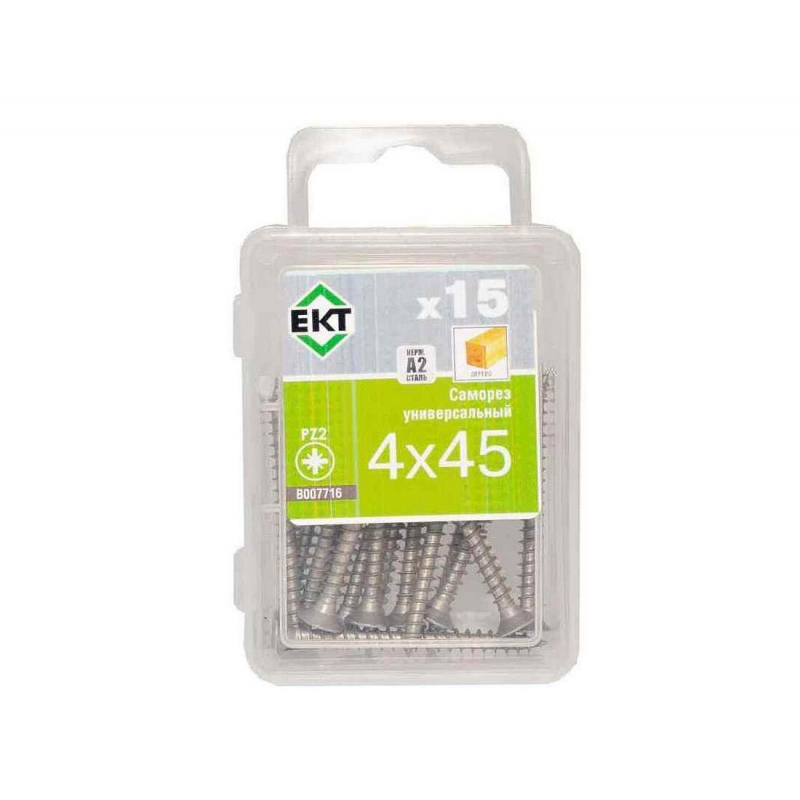 Универсальный саморез из нержавеющей стали 4,0х45 мм с острым наконечником. Упаковка: пластиковый контейнер (15 шт.). Произведено в Германии, бренд ЕКТ.