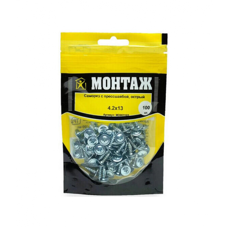 Саморез с прессшайбой острый 4.2х13 мм из оцинкованной стали. Бренд: МОНТАЖ. Упаковка: дой-пак S (100 шт). Производитель: ООО «ЕКТ Компани», Беларусь. Вес: 0.1 кг.