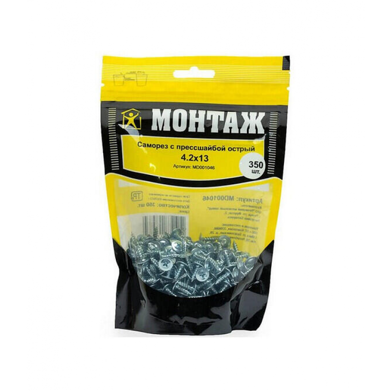 Саморез с прессшайбой, острый, диаметр 4.2 мм, длина 13 мм. Изготовлен из оцинкованной стали. Упаковка: 350 штук в пакете. Вес упаковки: 0.409 кг. Производитель: ООО «ЕКТ Компани», Беларусь.