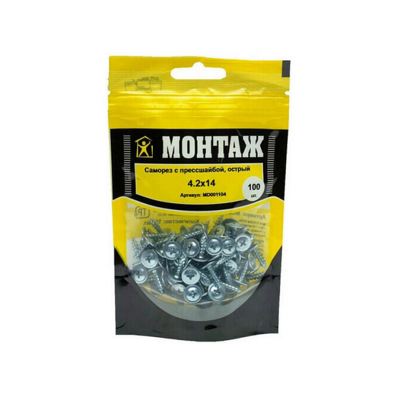 Саморезы острые П/Ш с прессшайбой, 4.2х14 мм. Изготовлены из оцинкованной стали. В упаковке: 100 шт. Производство: Беларусь, бренд МОНТАЖ.