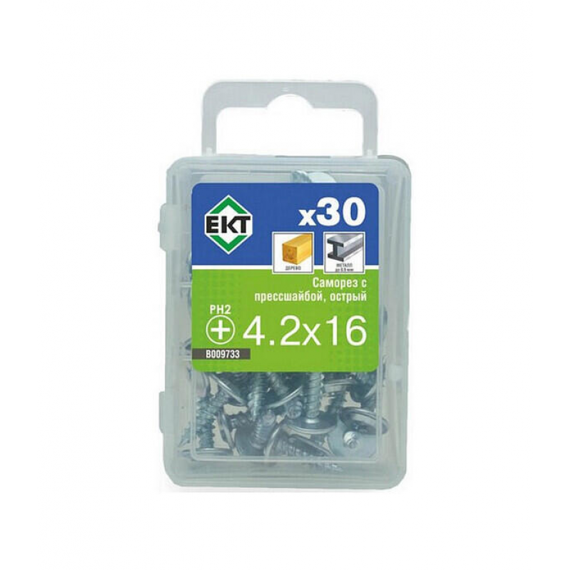 Саморез с прессшайбой от бренда ЕКТ. Размер: 4.2х16 мм. Острый наконечник, материал: оцинкованная сталь. Упаковка: пластиковый контейнер (30 штук).