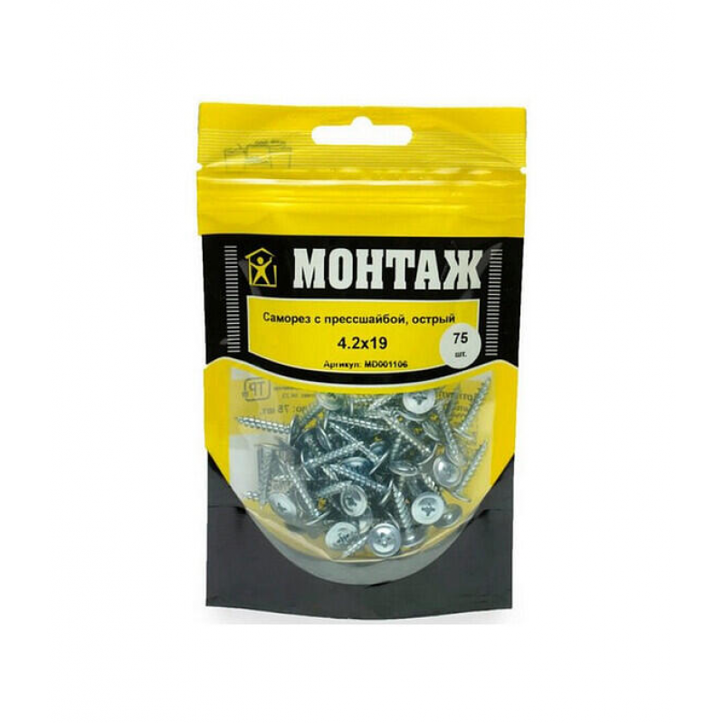 Саморез П/Ш с прессшайбой, острый наконечник. Диаметр: 4.2 мм, длина: 19 мм. Материал: оцинкованная сталь. Упаковка: дой-пак S (75 шт/уп). Производитель: ООО «ЕКТ Компани», Беларусь.