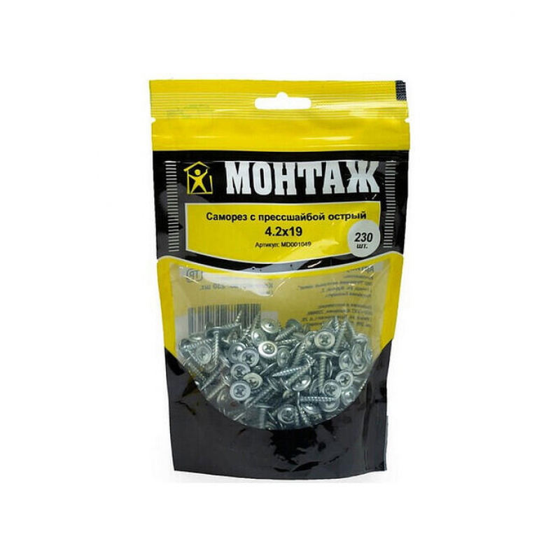 Саморезы с прессшайбой от бренда Монтаж. Оцинкованная сталь, острый наконечник. Размер: 4.2х19 мм. Упаковка: 230 шт. Вес: 0.43 кг. Производитель: ООО «ЕКТ Компани», Беларусь.