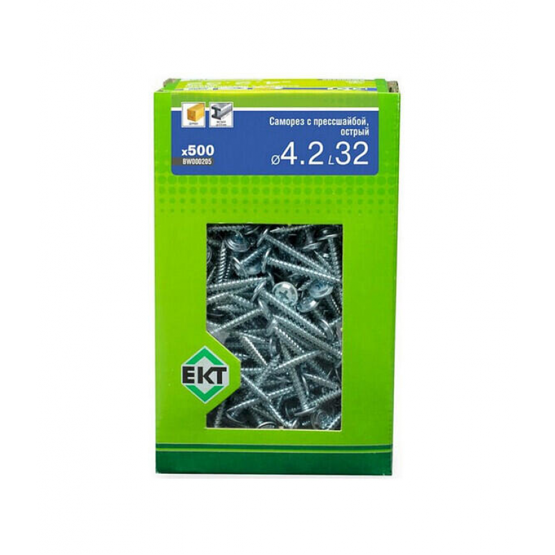 Саморез с прессшайбой, острый наконечник. Размер: 4.2х32 мм. Материал: оцинкованная сталь. Упаковка: картонная коробка с окном (500 шт). Бренд: ЕКТ.
