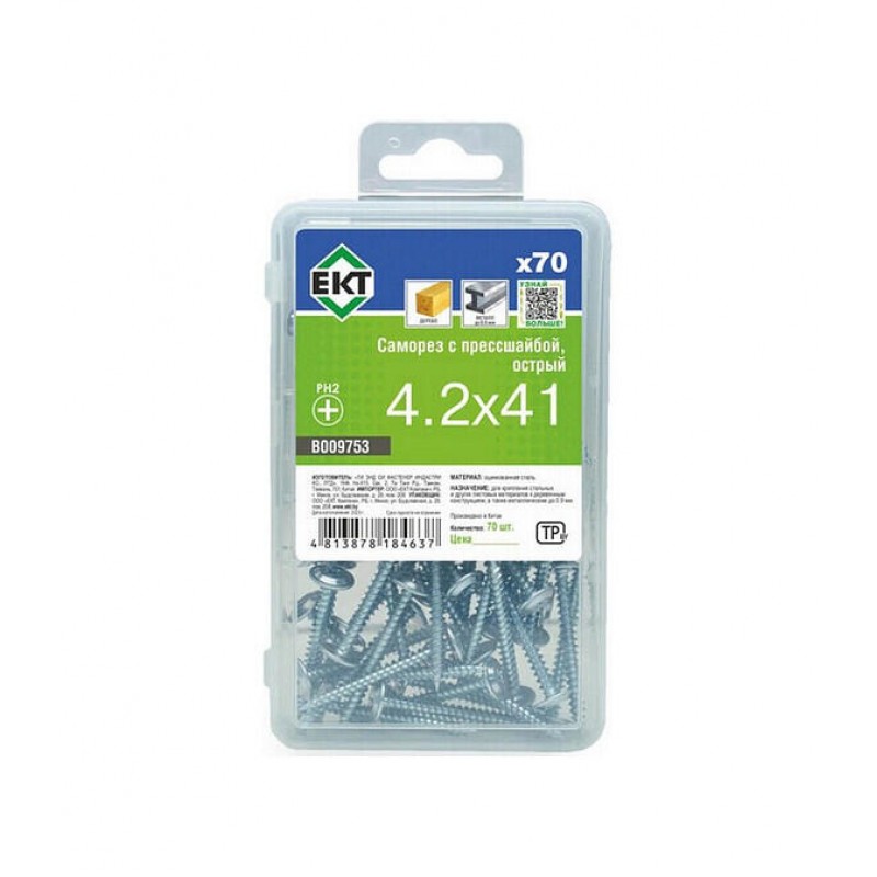 Острые саморезы с прессшайбой 4.2х41 мм из оцинкованной стали. Упаковка: пластиковый контейнер (70 шт).