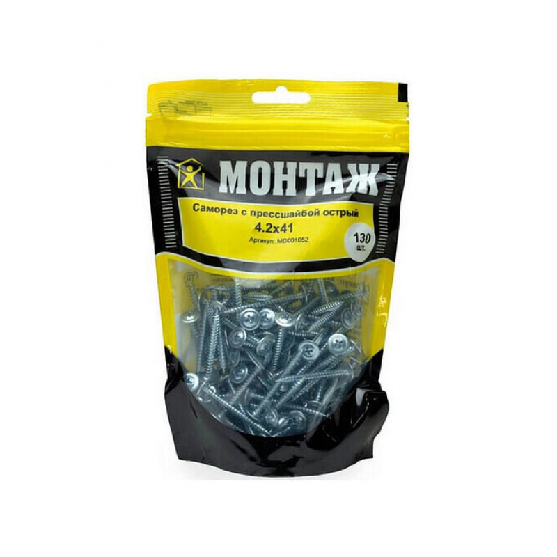 Острый саморез с прессшайбой 4.2х41 мм. Предназначен для крепления дерева и металла. Изготовлен из стали. Упаковка содержит 130 штук.