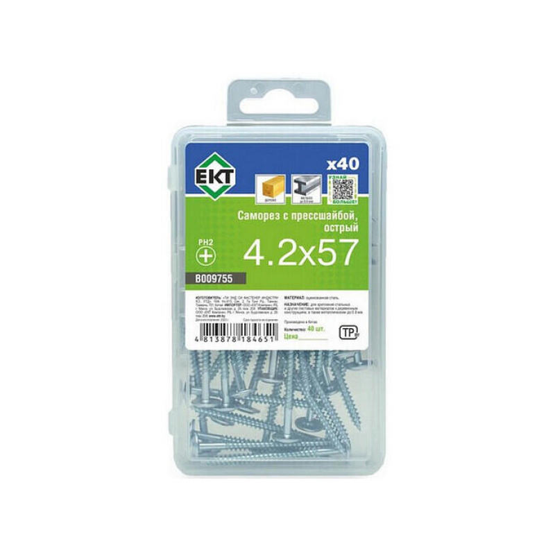 Саморез с прессшайбой из оцинкованной стали, острый наконечник. Размер: 4.2х57 мм. Упаковка: пластиковый контейнер (40 шт).