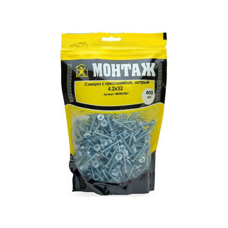 Острые саморезы с прессшайбой из оцинкованной стали. Диаметр 4.2 мм, длина 32 мм. Упаковка: 400 шт.