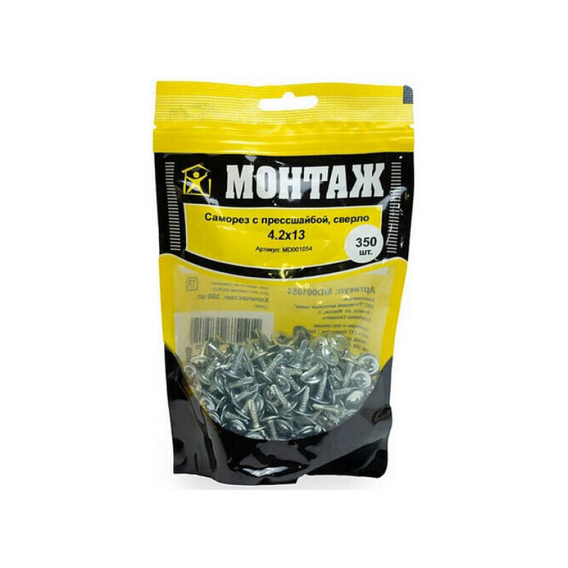 Саморез по металлу с прессшайбой Монтаж. Размер: 4.2х13 мм. Изготовлен из оцинкованной стали. Наконечник со сверлом для легкого вкручивания. Упаковка: пакет (Дойпак) на 350 штук. Производитель: ООО «ЕКТ Компани», Беларусь. Вес упаковки: 0.58 кг.