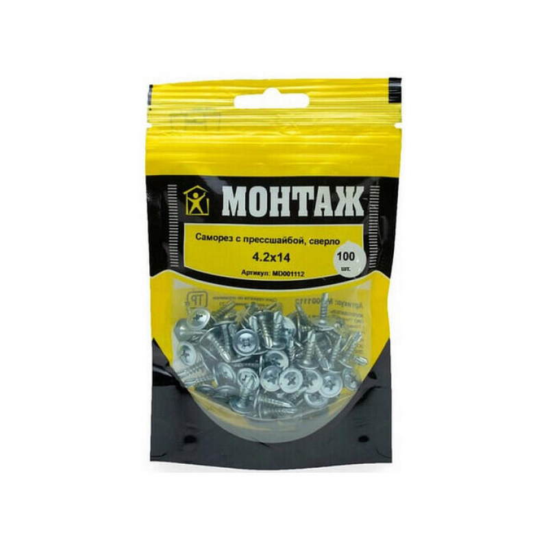 Саморез с прессшайбой МОНТАЖ, 4.2х14 мм. Оцинкованная сталь, наконечник со сверлом. Упаковка: дой-пак S (100 шт).