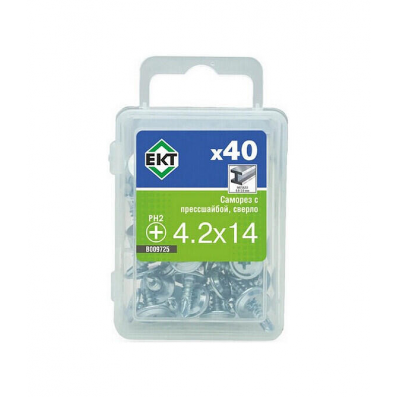 Саморез с прессшайбой из оцинкованной стали. Диаметр резьбы: 4.2 мм, длина: 14 мм. Наконечник со сверлом. Упаковка: пластиковый контейнер (40 шт). Вес упаковки: 0.1 кг. Бренд: ЕКТ, производство: Китай.
