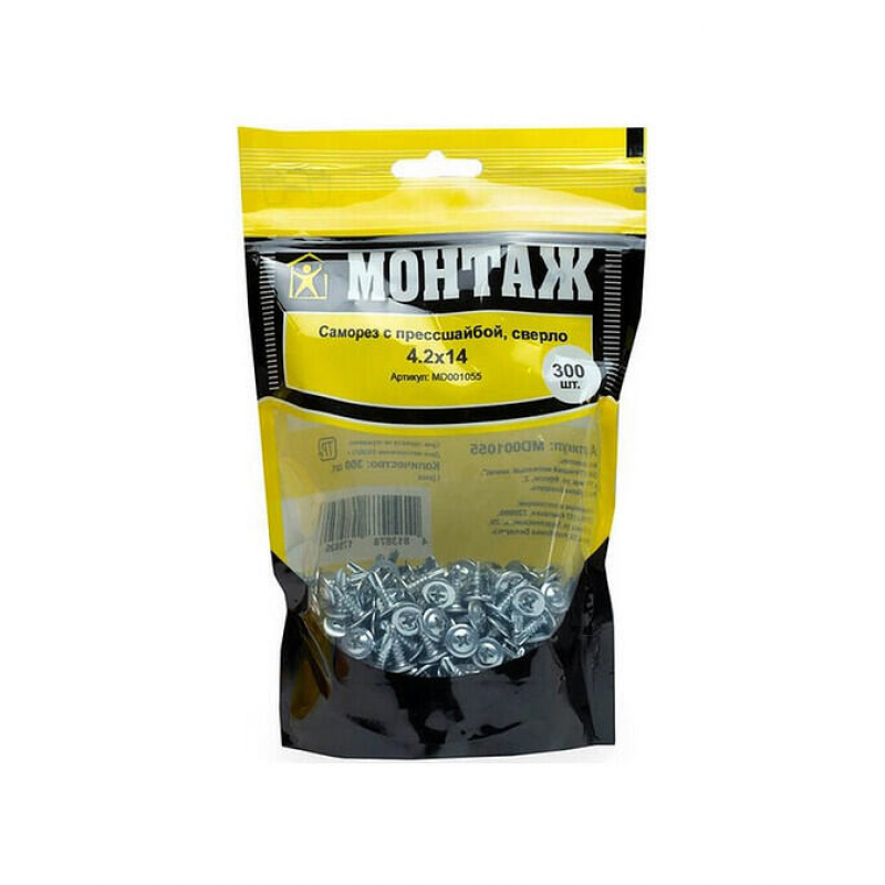 Саморезы Монтаж с прессшайбой, 4.2х14 мм. Оцинкованная сталь, наконечник со сверлом. Упаковка: 300 шт. в пакете. Производитель: ООО «ЕКТ Компани», Беларусь. Вес: 0.5 кг.