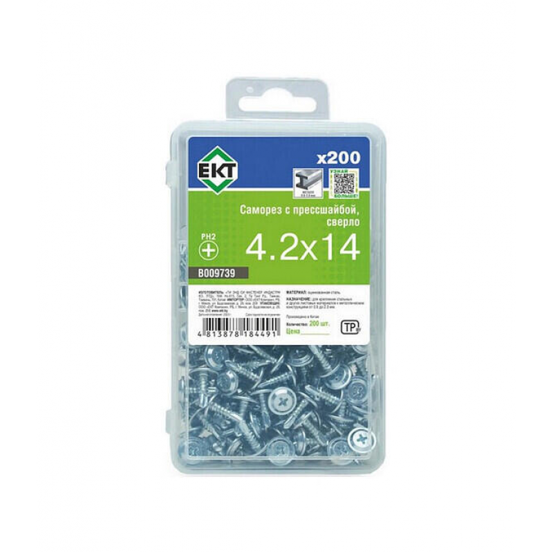 Саморез с прессшайбой, тип П/Ш. Диаметр 4.2 мм, длина 14 мм. Наконечник со сверлом, материал - оцинкованная сталь. Упаковка: пластиковый контейнер (200 шт). Бренд: ЕКТ.