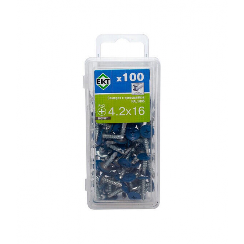 Саморез с прессшайбой и сверлящим наконечником 4.2х16 мм, цвет RAL5005 (синий). Предназначен для крепления листового металла (до 2.0 мм толщиной) и других материалов к металлическим/деревянным основаниям без предварительного сверления. Материал: оцинкованная сталь. Упаковка: 100 шт. в пластиковом контейнере.