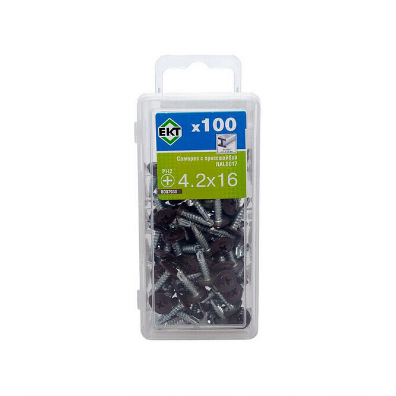 Саморез П/Ш с прессшайбой 4.2х16 мм, цвет RAL8017. Изготовлен из оцинкованной стали, наконечник со сверлом (диаметр 3.35-3.50 мм). Упаковка: пластиковый контейнер, 100 шт.
