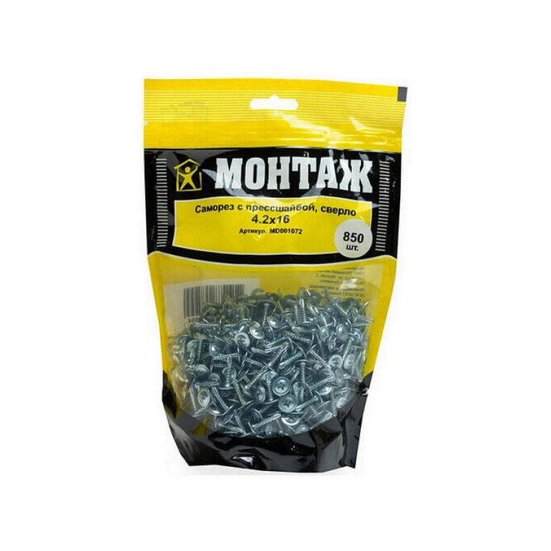 Саморез П/Ш с прессшайбой, 4.2х16 мм. Материал: оцинкованная сталь. Наконечник со сверлом для легкого вкручивания. Упаковка: пакет Дойпак на 850 шт. Вес: 1.152 кг. Производитель: ООО «ЕКТ Компани», Беларусь.