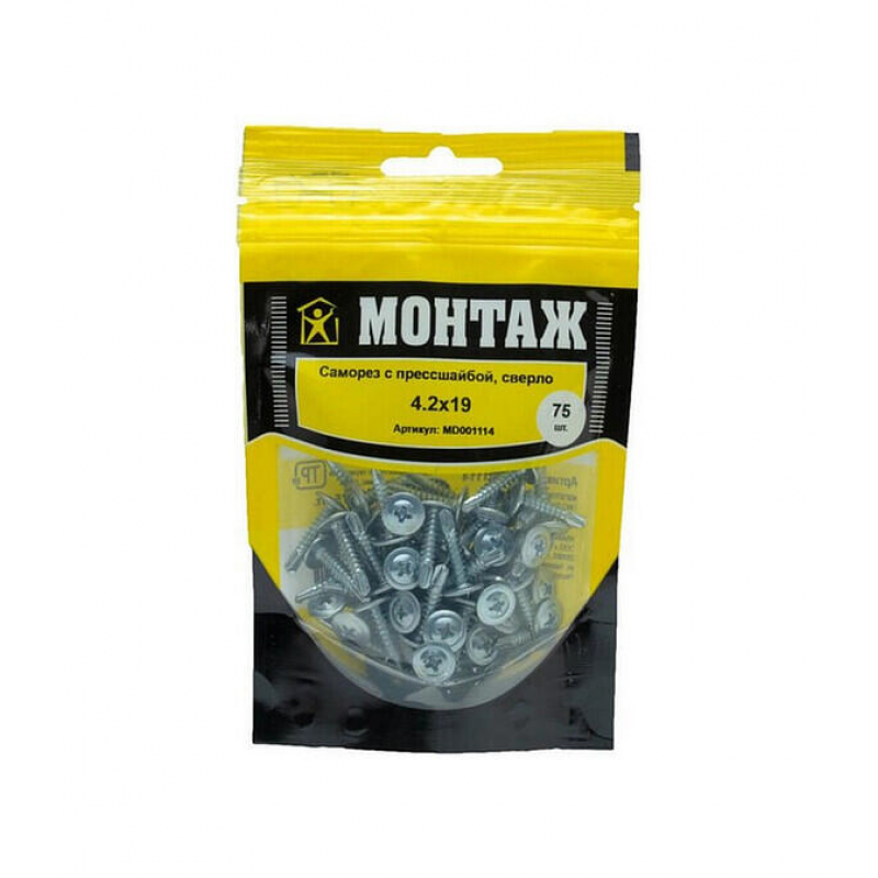 Саморез с прессшайбой, размер 4.2х19 мм. Изготовлен из оцинкованной стали, оснащен сверловым наконечником. Упаковка: дой-пак на 75 штук. Бренд: МОНТАЖ, производство Беларусь.