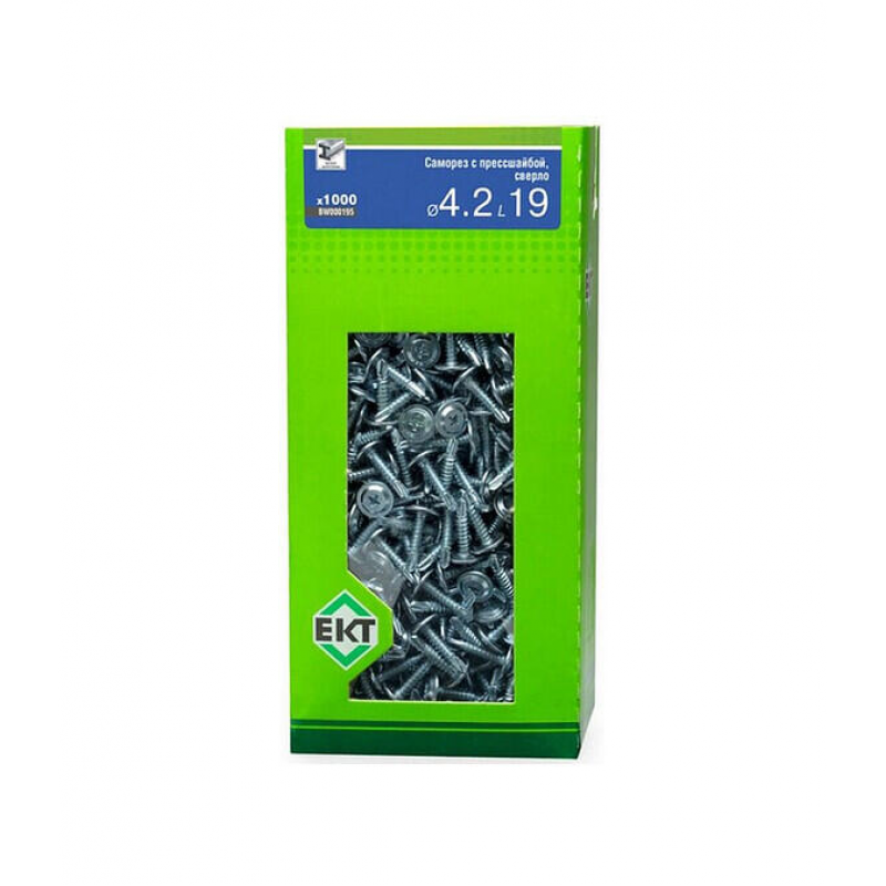 Саморез с прессшайбой, размер 4.2х19 мм, из оцинкованной стали. Наконечник со сверлом для металла. Упаковка: картонная коробка с окном, 1000 шт.