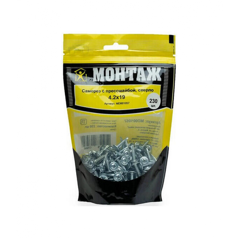 Саморез по металлу с прессшайбой, размер 4.2х19 мм. Оцинкованная сталь, наконечник со сверлом. Упаковка: 230 штук в пакете.