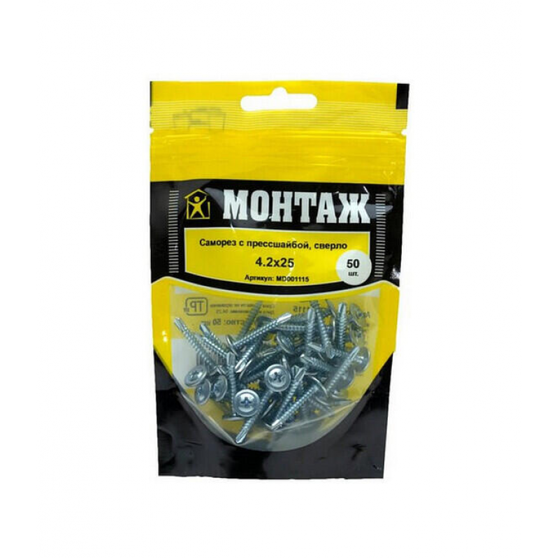 Саморез с прессшайбой бренда МОНТАЖ, размер 4.2х25 мм. Изготовлен из оцинкованной стали с наконечником-сверлом. Упаковка: дой-пак S (50 шт). Производитель: ООО «ЕКТ Компани», Беларусь. Вес упаковки: 0.3 кг.