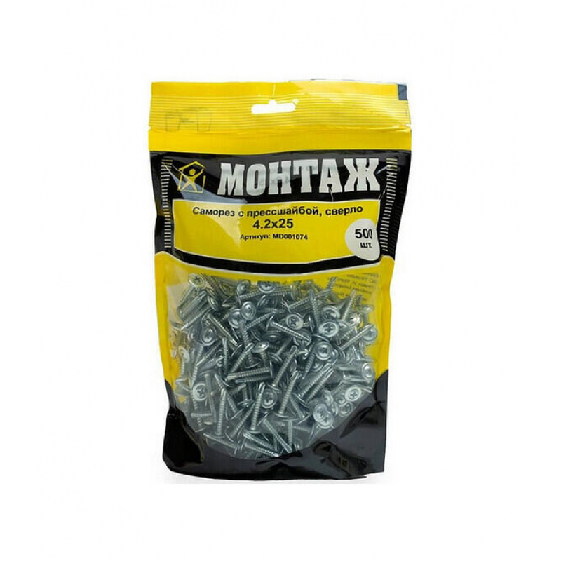 Саморезы с прессшайбой от бренда Монтаж для крепления металлических поверхностей. Оцинкованная сталь, диаметр 4.2 мм, длина 25 мм. Наконечник со сверлом. Упаковка: 500 шт в пакете. Производитель: ООО «ЕКТ Компани» (Беларусь). Вес: 1.17 кг.