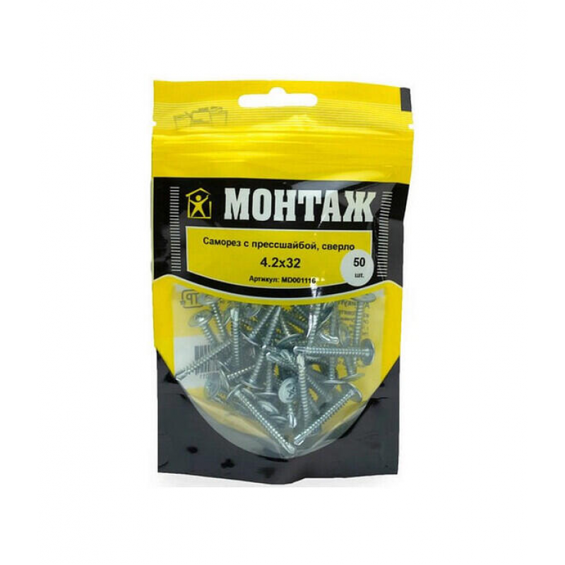Саморез с прессшайбой МОНТАЖ. Оцинкованная сталь, наконечник со сверлом. Диаметр 4.2 мм, длина 32 мм. Упаковка: дой-пак, 50 шт.
