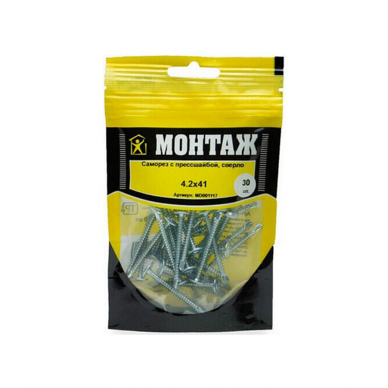 Саморез с прессшайбой МОНТАЖ 4.2х41 мм. Изготовлен из оцинкованной стали, наконечник со сверлом. Упаковка: дой-пак S (30 шт). Производитель: ООО «ЕКТ Компани», Беларусь. Вес упаковки: 0.1 кг.
