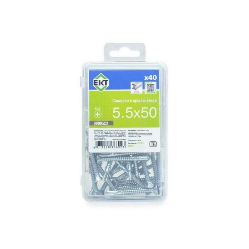 Саморез с крыльчаткой 5,5х50 мм от бренда ЕКТ. Сталь с цинковым покрытием, острый наконечник со сверлом. Упакован в пластиковый контейнер по 40 штук.