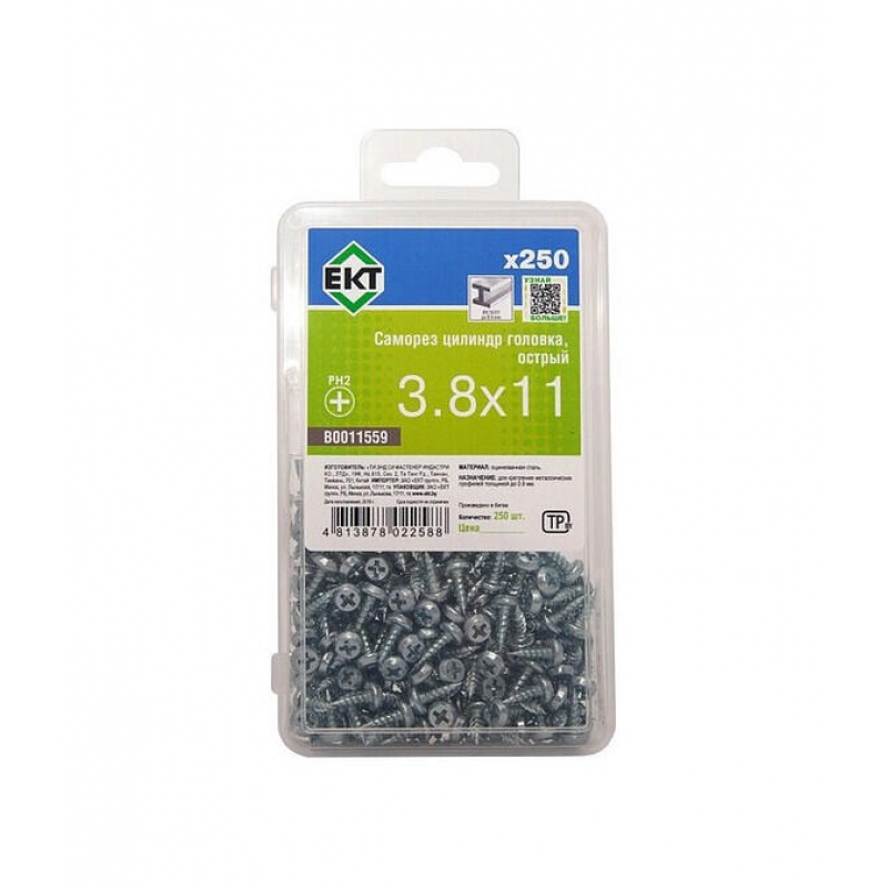 Саморез с цилиндрической головкой, острый, 3.8х11 мм. Материал: сталь с цинковым покрытием. Предназначен для металла. Упакован в пластиковый контейнер: 250 штук. Бренд: ЕКТ.