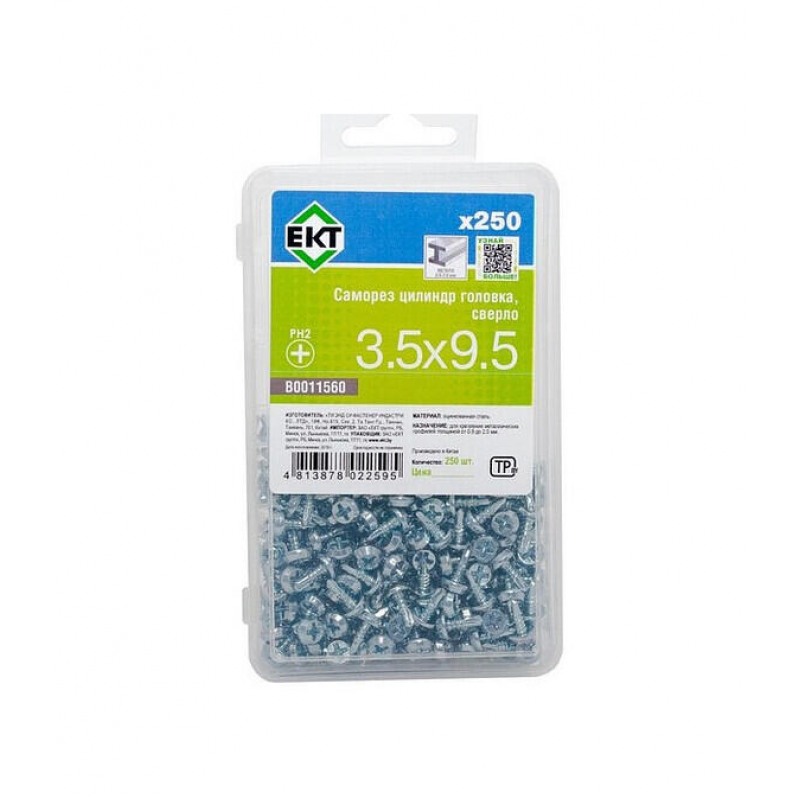 Саморез ЕКТ с цилиндрической головкой, размер 3.5х9.5 мм. Оснащен сверловым наконечником, имеет цинковое покрытие. Упакован в пластиковый контейнер (250 шт).