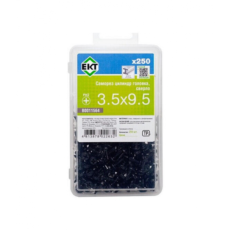 Саморез с цилиндрической головкой для металла, размер 3,5х9,5 мм. Оснащен сверлящим наконечником, покрытие - черный фосфат. Упакован в пластиковый контейнер, 250 шт.