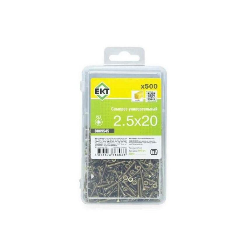 Универсальный саморез из стали с желтым цинковым покрытием. Диаметр: 2.5 мм, длина: 20 мм. Упаковка: пластиковый контейнер (500 шт). Бренд: ЕКТ, производство: Китай.