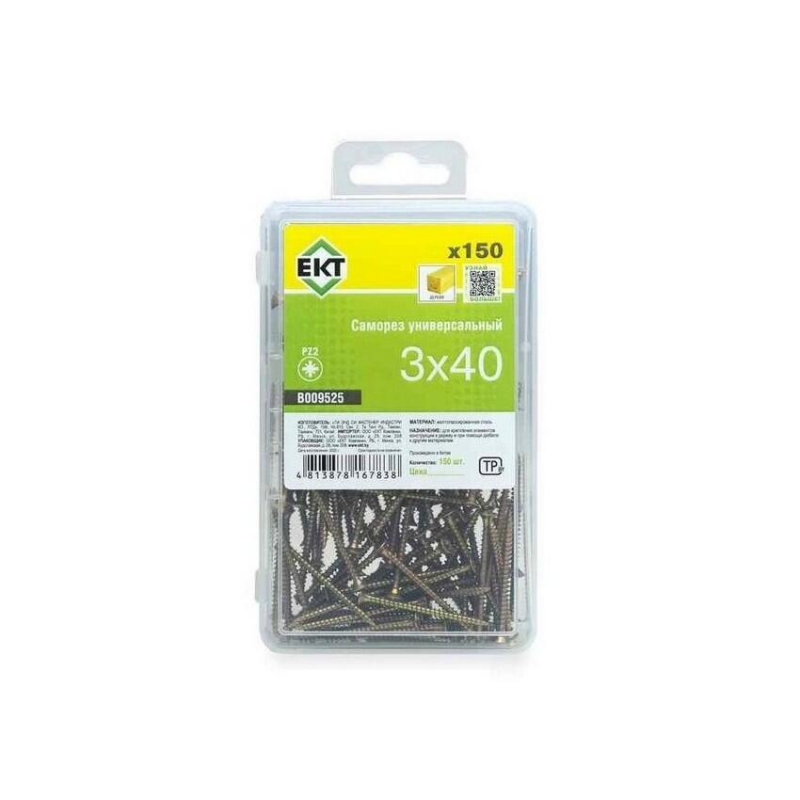 Универсальный саморез из стали с желтым цинковым покрытием. Диаметр: 3.0 мм, длина: 40 мм. Острый наконечник. Упаковка: пластиковый контейнер (150 шт), вес 0.2 кг. Бренд: ЕКТ, производитель: ООО «ЕКТ Компани», Китай.
